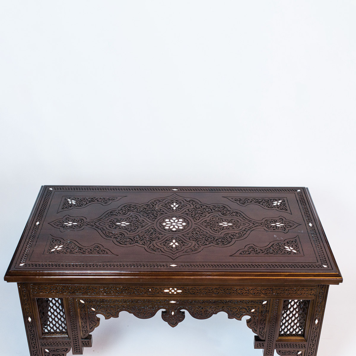 Made from genuine walnut wood. This stunning table is hand carved with floral and geometric patterns inspired from Arab culture. It is made in a very unique manner with carving details followed with extreme diligence and covered with mother of pearl.