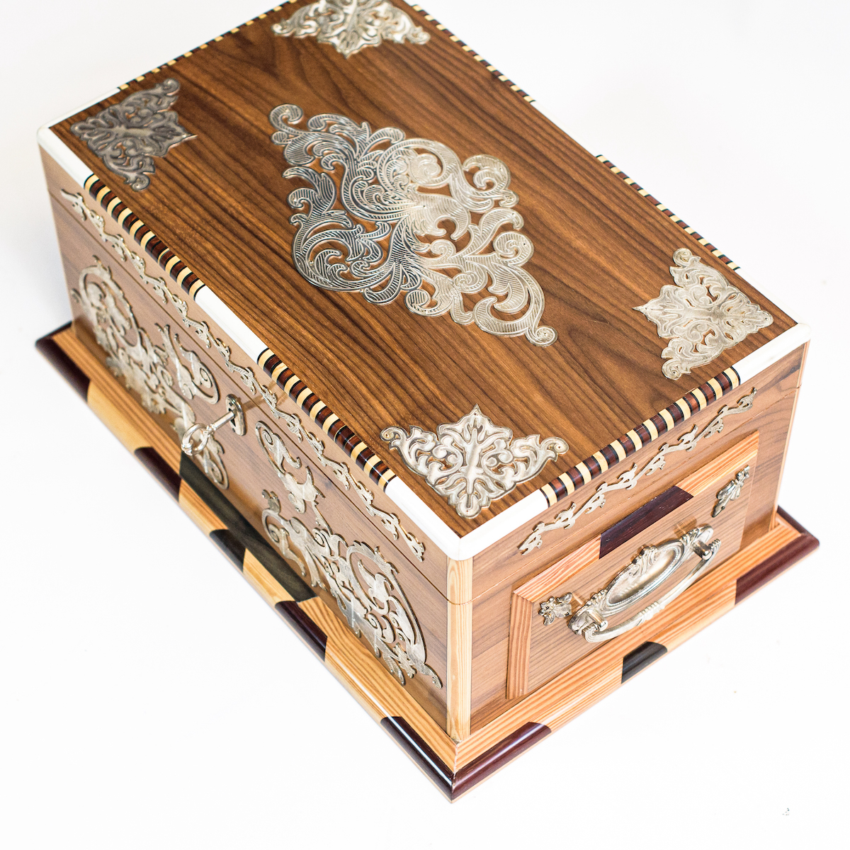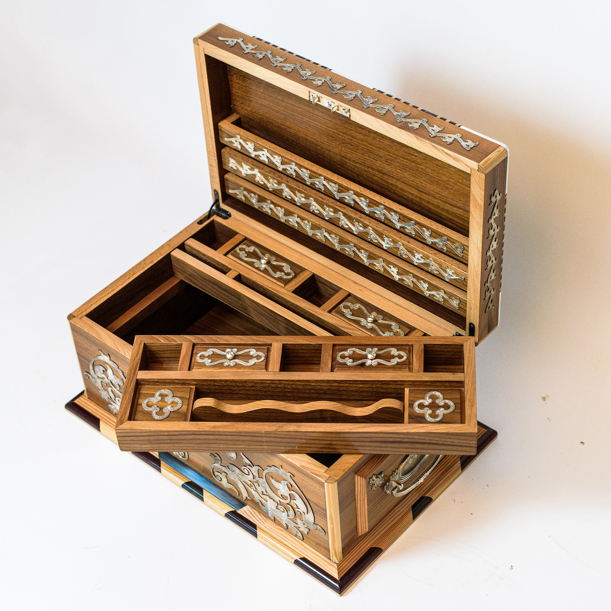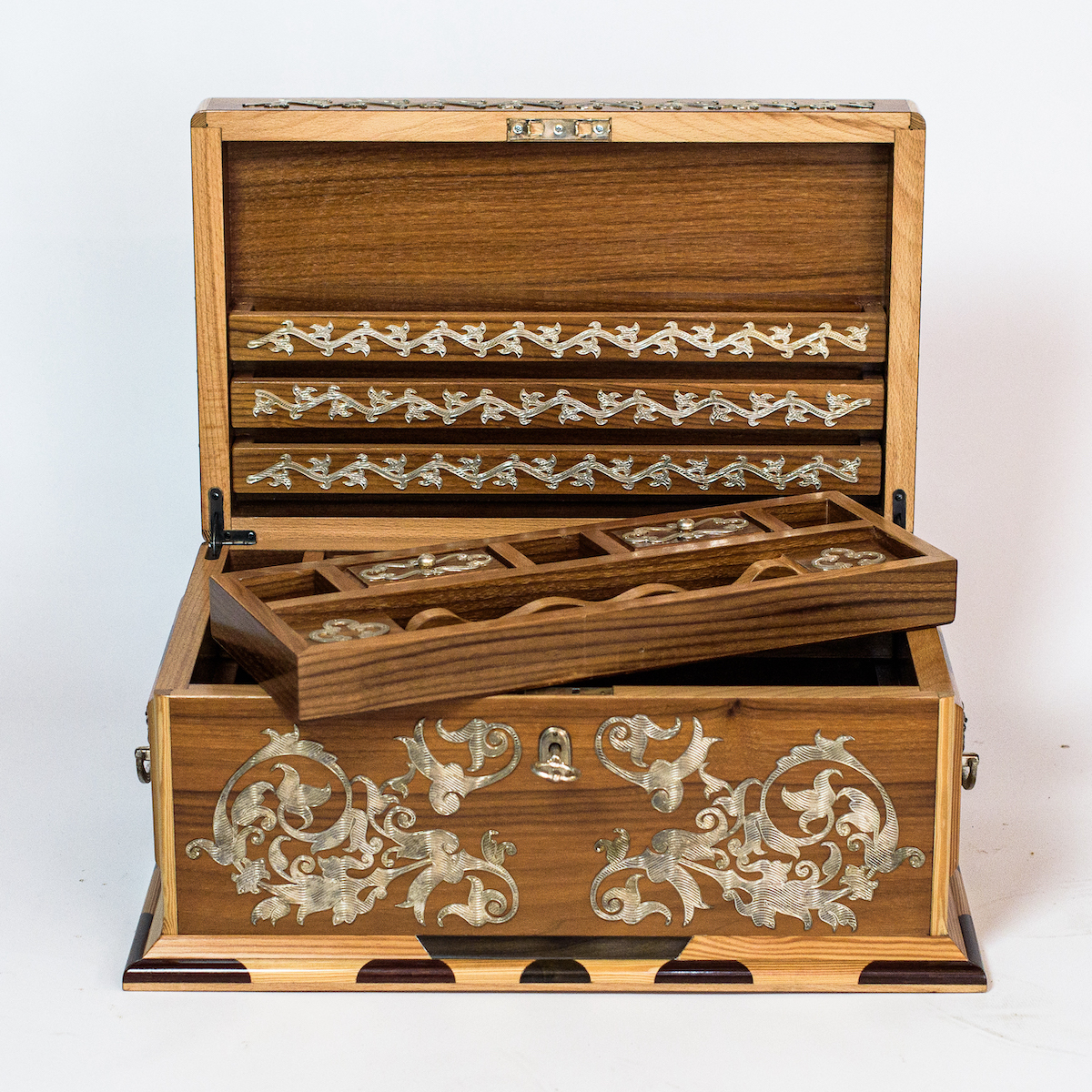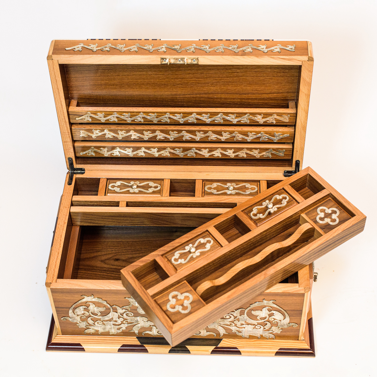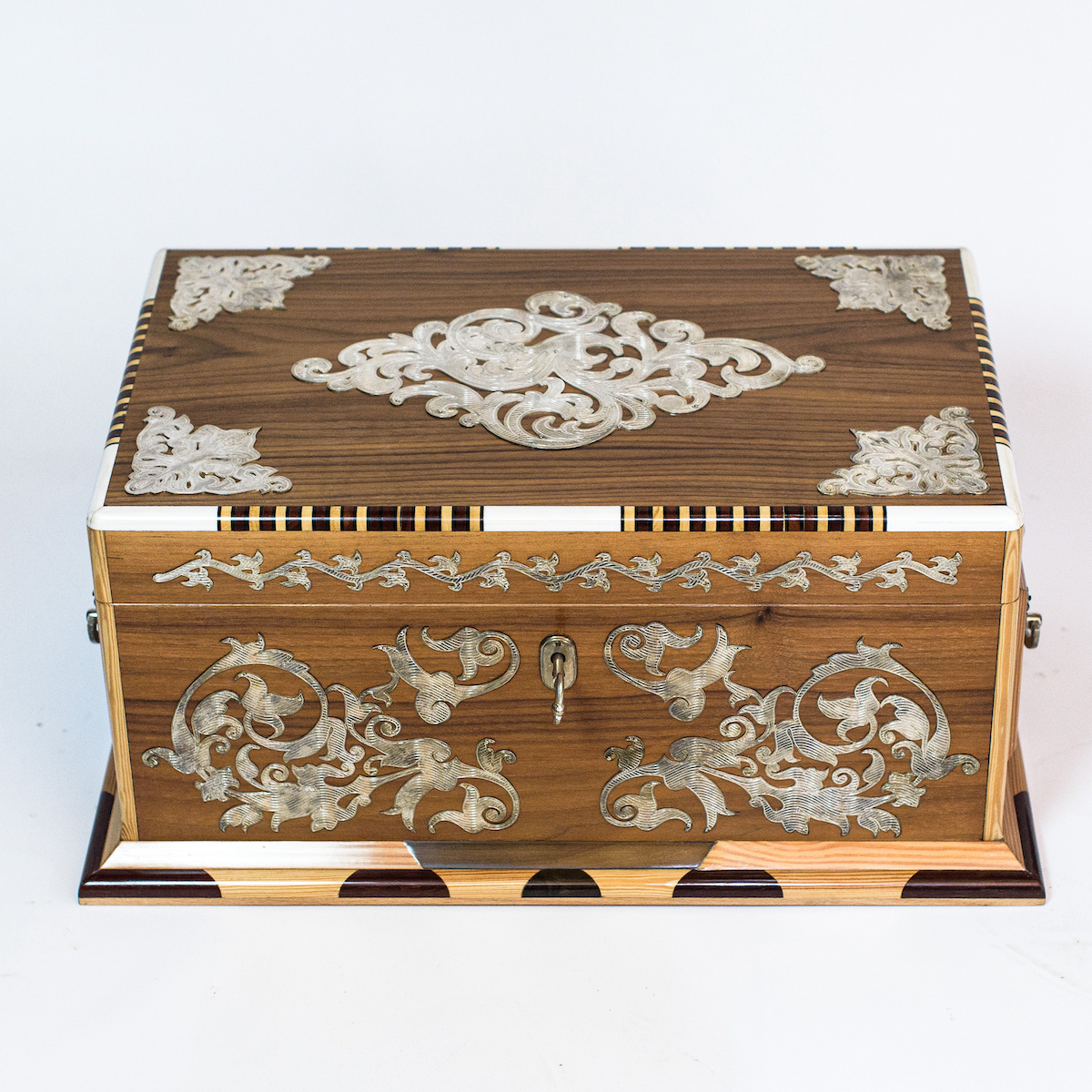 The elaborate adornment with the iridescence of intricate mother of pearl designs makes it a breathtaking piece for storing personal fashion items. The rhythmic line design gives the beautiful panache to this unique shaped jewelry box. Plus, it has a hidden compartment and key to lock it.