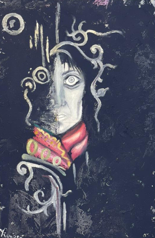 This oil painting in the name of ”The Black Devil” shows an woman’s face wearing a red scarf with a black background.