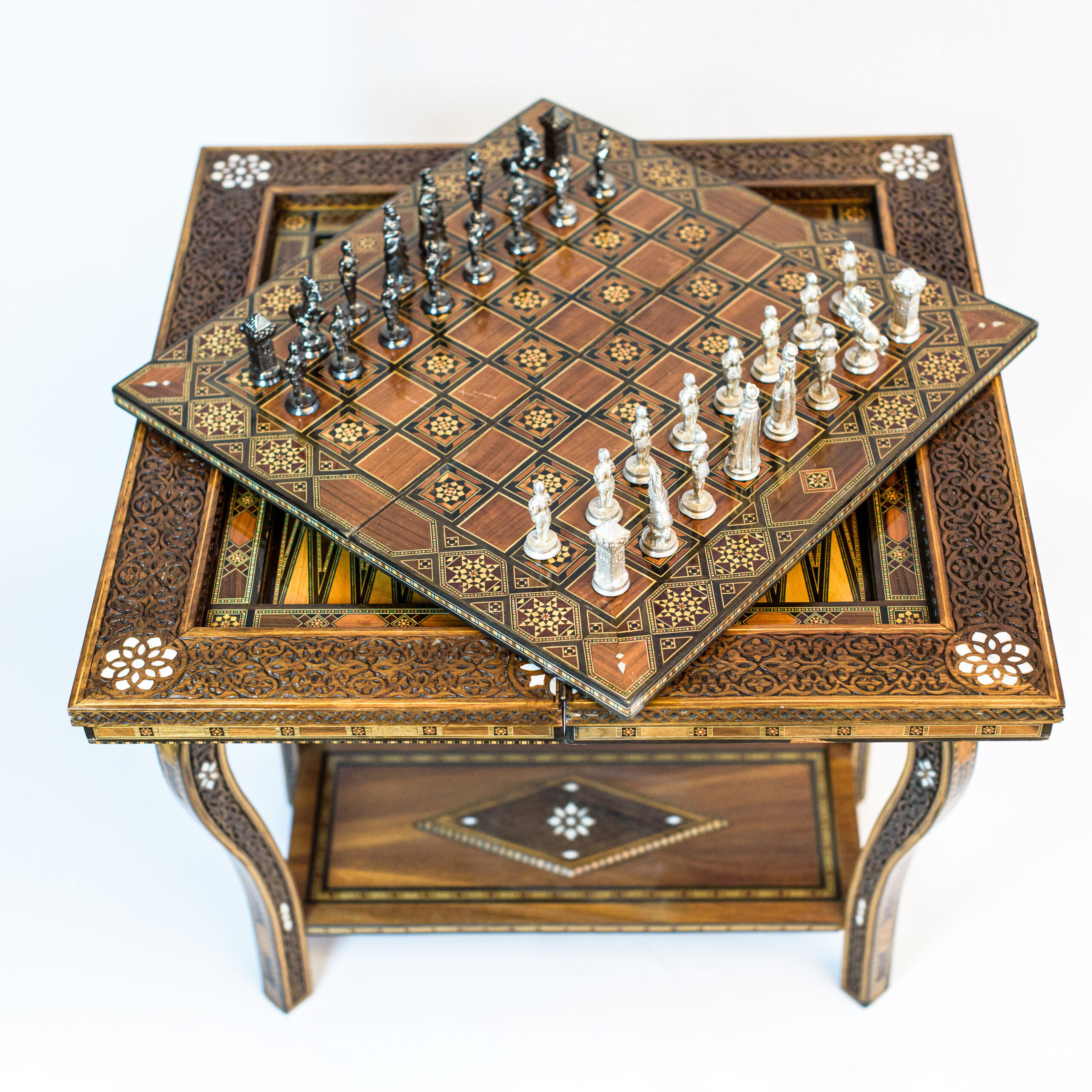 Large profusely inlaid games table, the top with multiple geometric and asymmetric inlays of various woods and mother of pearl. The deep top opens to reveal similarly inlaid interior and a section with a hinged center which lifts to reveal a chess and a backgammon table and like the outside is profusely inlaid.